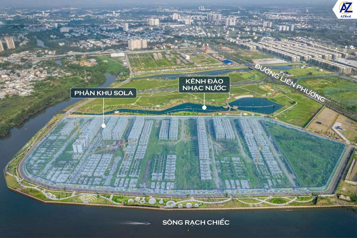 SOLA Global City là một trong số rất ít phân khu tại TP.Thủ Đức cũ sở hữu thế đất ba mặt giáp sông Rạch Chiếc, đồng thời tiếp giáp trực tiếp kênh đào nhạc nước trung tâm.